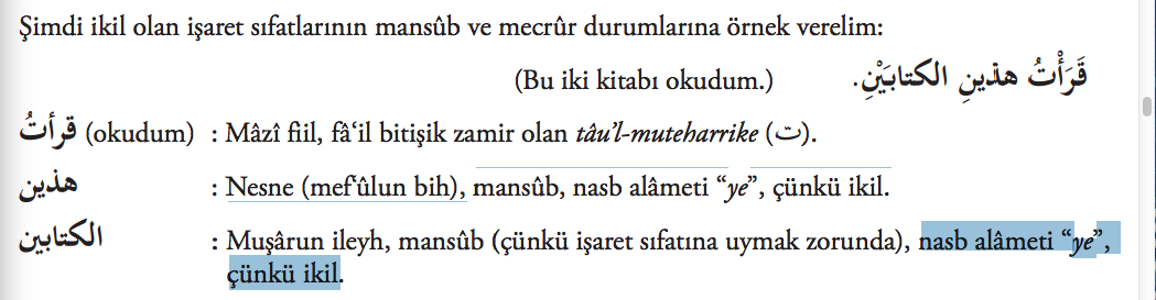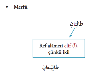 Kelime cümle içerisinde merfûluğu gerektiren bir konumdaysa ِــان âni eki, mansûb veya mecrûr konumdaysa eyni eki alır. İkillerde ref alâmeti elif ا ,nasb ve cer alâmeti ye ي‘dir. Nûn ن her üç durumun ortak harfi olduğundan belirleyici etkisi yoktur, alâmette zikredilmez.