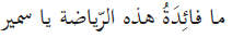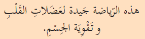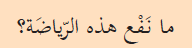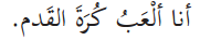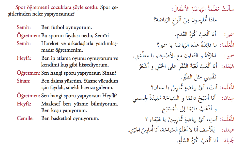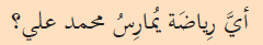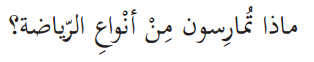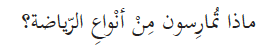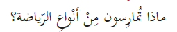 Verilen Arapça ifadede "Spor çeşitlerinden neler yapıyorsunuz?" diye soruluyor, bu sorunun karşılığı olabilecek ifade B seçeneğinde verilmiştir: "Ben futbol oynuyorum".