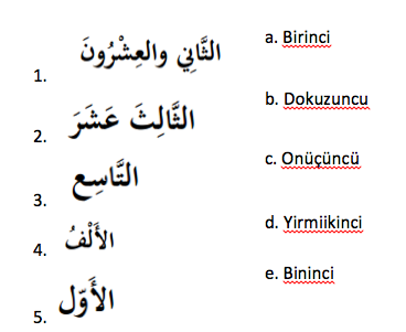 Aşağıda verilen sıra sayılarının Arapça karşılıklarıyla eşleşmesi hangi şıkta doğru olarak verilmiştir?