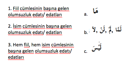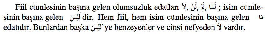 Bu edat da, ْ لمَ gibi, devamlı muzâri fiilin başında gelir. ْ لمَ gibi, muzâri fiilin manasını olumsuz geçmişe çevirir. Ancak ْ لََّما .deki olumsuzluk, mutlaktır َلم daki olumsuzluk, sözü edilen geçmiş zamandan, konuşulan âna kadar devam eder. َّمَال bulunan cümlede “henüz” veya “hâlâ” ifadeleri kullanılır. ٌّي ِ َل ُ ْب ع َ ْكت لََّما ي ُ َه ْس َر د cümlesinin tercümesini şöyle yaparız: “Ali dersini henüz/hâlâ yazmadı”. َ ْس :لَي Bu, ان َ كَ nin benzerlerinden, nâkıs, mâzî bir fiildir. ان َ كَ gibi ismini raf, haberini nasbeder ve isim cümlesini olumsuz hale getirir. Genel olarak “değil” anlamındadır. Örnek:ينَ يِّ ِ ِلنـَّْفع ً ل ْ َصة ُ ُفـر َة الصَداق َ ِت َّ ْس يَول (Dostluk, benciller için bir fırsat değildir). Bu cümlede, تِ َ ْس ُ ,in ismi لَي َة الصَداق ً haberi , َّ ْ َصة .dir ُفـر Cümleye olumsuzluk anlamı verdiren, تِ َ ْس