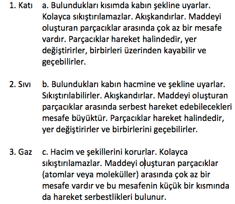 Gazlar: Bulundukları kabın hacmine ve şekline uyarlar. Sıkıştırılabilirler. Akışkandırlar. Gazı oluşturan parçacıklar arasında serbest hareket edebilecekleri mesafe büyüktür. Parçacıklar hareket halindedir, yer değiştirirler ve birbirlerini geçebilirler.