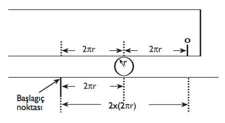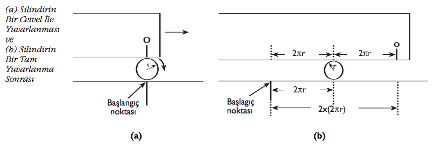 İlk önce silindiri, sabit bir zemin üzerinde, bir cetvelin kaydırmadan yuvarladığı durumu ele alalım. Şekil 1.31a’da, r yarıçaplı silindirin, cetvelin “0” çizgisinde yuvarlanmaya başlaması ve (b)’de ise bir tam yuvarlanma sonunda cetvelin “0” çizgisi ile silindirin konumu gösterilmektedir. Burada silindir, çevresi 2?r olduğu için, başlangıç noktasına göre yuvarlanarak bu kadar yol almıştır. Cetvel de silindiri yuvarladığı için, silindire göre 2?r kadar ileriye gitmiştir. Buradan, cetvelin “0” çizgisinin başlangıç noktasına göre 2 × 2?r yol almış olduğu ortaya çıkar. Bir diğer ifadeyle, silindir yuvarlanarak ne kadar yol alırsa, cetvel onun iki misli yol alır.