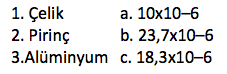 Yukarıda verilen maddelerle, boyca uzama katsayılarını eşleştiriniz.