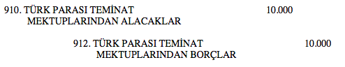 Yevmiye kaydında 910. Türk Parası Teminat Mektuplarından Alacaklar Hesabı borçlandırılmış ve 912. Türk Parası Teminat Mektuplardan Borçlar Hesabı alacaklandırılmıştır. Yapılan bu yevmiye kaydında teminat mektubunun müşteriye teslim edilmesi işlemi gerçekleştirilmiştir.