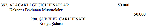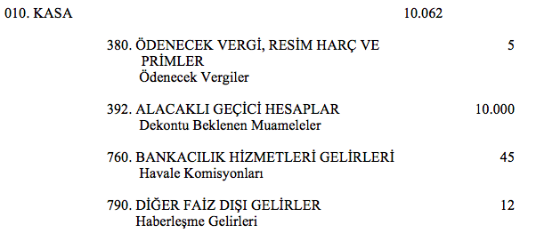 Yevmiye kaydında havale yapmak isteyen müşteriden ?10.062 tahsil edildiğinden dolayı 010. Kasa Hesabı aynı tutarda borçlandırılmıştır. Bu tutarın ?10.000’si havale edilecek tutar olduğundan dolayı 392. Alacaklı Geçici Hesaplar bu tutarda alacaklandırılmış ardından ödenecek vergiler, havale komisyonu ve haberleşme geliri ilgili hesaplarda alacaklandırılmıştır. Yapılan bu yevmiye kaydında banka, müşterinin havale talimatı talebini kayda geçirmiştir.