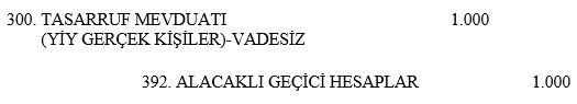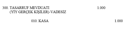 Müşteri tasarruf mevduatından ?1.000 para çekmek istediğinden dolayı banka yevmiye kaydını, 300. Tasarruf Mevduatı-Vadesiz hesabını borçlandırarak ve 010. Kasa hesabını alacaklandırarak tamamlamaktadır.