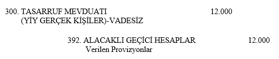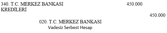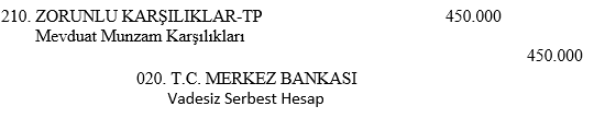 Bankanın topladığı mevduatlardan dolayı T.C. Merkez Bankası'na aktarması gereken zorunlu karşılıkların kaydedilmesi için 210. Zorunlu Karşılıklar Hesabı borçlandırılmış ve 020. T.C. Merkez Bankası Hesabı alacaklandırılmıştır.
