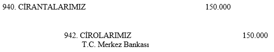 Yevmiye kaydında 940. Cirantalarımız Hs. borçlandırılmış ve 942 Cirolarımız Hs. alacaklandırılmıştır. Bu işlemde banka, T.C Merkez Bankası'ndan reeskont kredisi sağlamak amacıyla elinde bulunan senedi Merkez Bankası'na ciro ederek vermiştir.