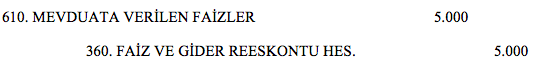 Yapılan yevmiye kaydında 610. Mevduata Verilen Faizler Hesabı borçlandırılarak ve 360. Faiz ve Gider Reeskontu Hesabı alacaklandırılarak dönem sonunda ilgili hesaba tahakkuk eden faiz muhasebeleştirilmiştir.