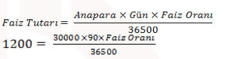 Bir bankada 90 gün vadeli hesap açtırarak 30.000 TL para yatıran bir kişi vade sonunda 1200 TL faiz getirisi elde ettiğine göre bankanın bu mevduata uyguladığı yıllık faiz oranı kaçtır?