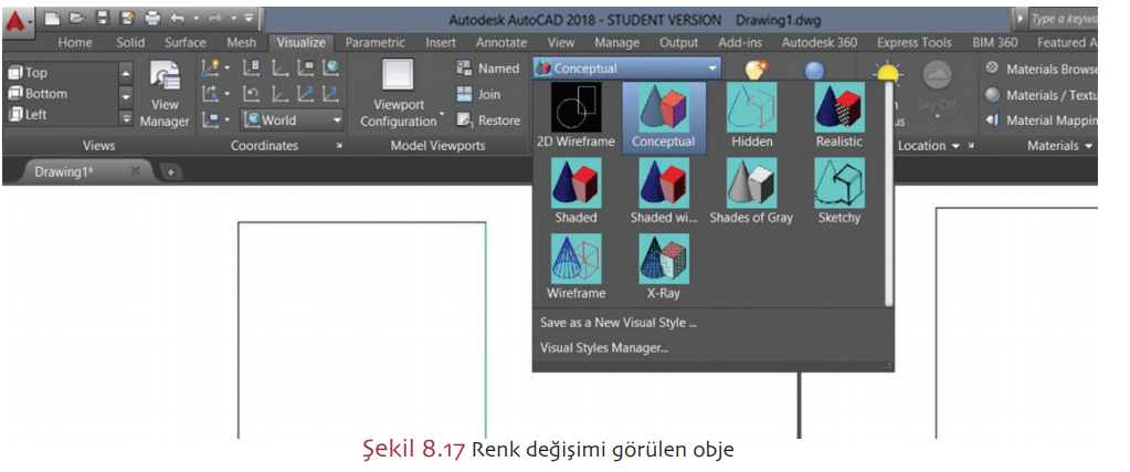 Boyanılan yüzeyin rengini görmek için; Visualize > Visual Styles > Conceptual sekmesi seçilir (Şekil 8.17).