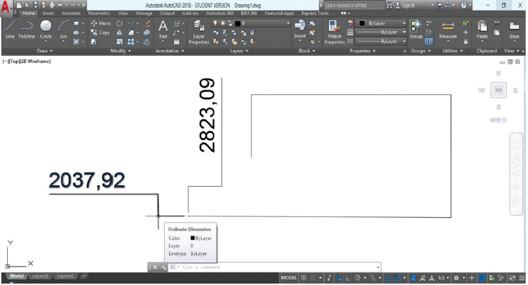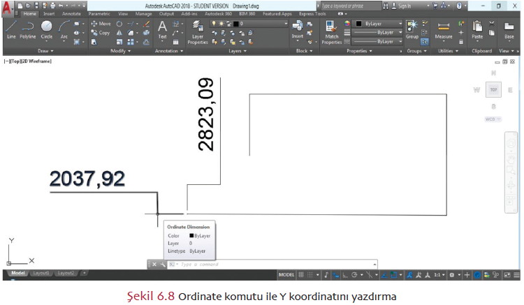 Y koordinatını yazdırmak için yine dimension > ordinate fonksiyonu seçilir. Çizgi uç noktası endpoint ile yakalanır. İmleç x ekseni yönünde hareket ettirilerek y koordinatı yazdırılır.