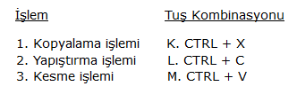 Kopyalama işlemini CTRL + C tuşlarına birlikte basarak. Yapıştırma işlemini CTRL + V tuşlarına birlikte basarak. Kesme işlemini de CTRL + X tuşlarına birlikte basarak gerçekleştirebiliriz. Doğru cevap E'dir.