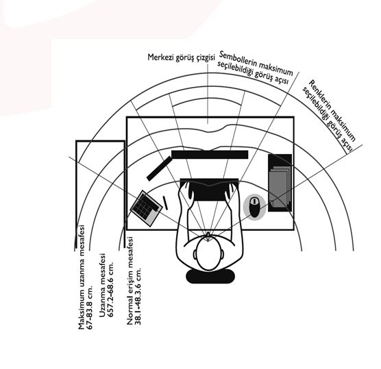 Şekilde gösterilen çalışma alanı erişim mesafeleri, bu donanımların çalışan kişinin oturduğu yerden uzanma mesafesine göre