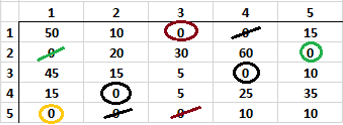 5. Identify the optimal solution by the coordinates of the zero-valued elements in the present matrix.