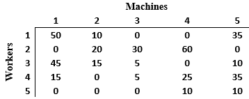 Four workers will be assigned to five machines in a manufacturing plant. The labor costs of the workers on the machines are given in TL below.
