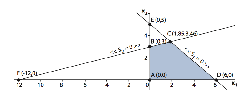 The corner points E and F are infeasible, as they do not meet the non-negativity constraints of the augmented model.