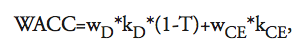 The weighted average cost of capital (WACC) is the average cost of the different types of capital employed by the firm. Where wD is the weight of the debt component, wCE is the weight of the equity component. T is the tax rate and after-tax cost of debt component is calculated by multiplying the before-tax cost of debt (kD) by the tax deductibility. Cost of equity component is denoted as kCE in the above equation. The correct answer is E.