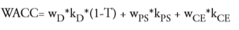 , where wD is the weight of debt financing in the capital structure, kD is the cost component of debt funds, T is the tax rate, accordingly wPS is the weight of preferred stocks, kPS is its cost component, wCE is the weight of common equity and kCE is the cost of equity capital. Therefore;
