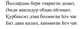 Yıllardan beri oynayan deniz, Şimdi vaktidir, güzel deyiniz. Kurbansız dava olmadı asla, Biz davamıza kanmadık asla. |