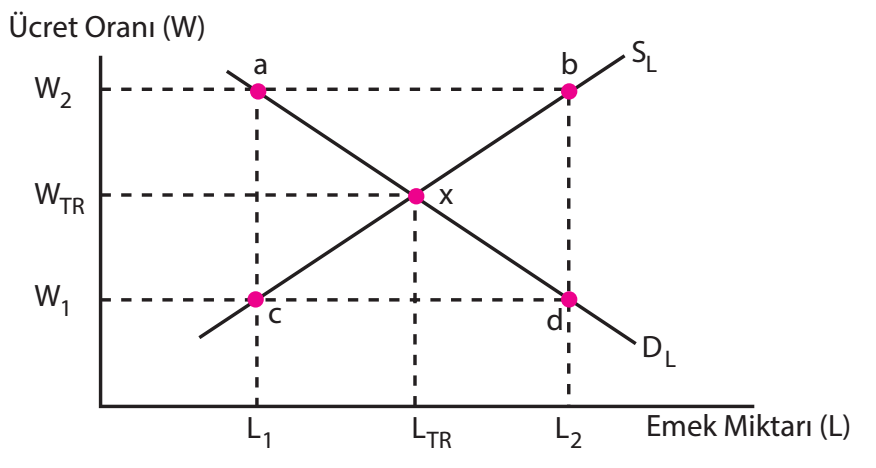 Bir malın piyasa denge fiyatı arz ve talep eğrilerinin kesiştiği noktada oluşmaktadır. Aynı analiz emek piyasasına uyarlanıldığında, tam rekabetçi bir emek piyasasında piyasa dengesinin emek arz (SL) ve talep (DL) eğrilerinin kesiştiği X noktasında kurulduğu görülmektedir. X noktasında denge ücreti olan WTR ücretine razı olup çalışmak isteyen herkes (LTR kadar işgücü) işverenler tarafından talep edileceğinden, piyasada işsizlik olmayacaktır.