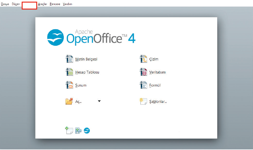Apache OpenOffice ana ekran menüleri sırasıyla Dosya, Düzen, Görünüm, Araçlar, Pencere ve Yardım'dan oluşmaktadır. Bu nedenle kırmızı dikdörtgen yerinde Görünüm yazması gerekmektedir.
