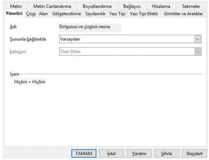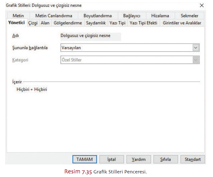 Impress yazılımı ile oluşturulan sunumlarda her ne kadar görsel ögelere önem verilse de konunun ana kısımlarının yazı olacağı bir gerçektir. Yazısal kısımların düzenlemesinin yapılacağı Biçim Menüsü sekmeleri aynı zamanda slaytların düzensel ayarlarının yapılacağı sekmeleri de içerisinde barındırmaktadır. Menü Sekmeleri Resim 7.21’de gösterilmektedir.