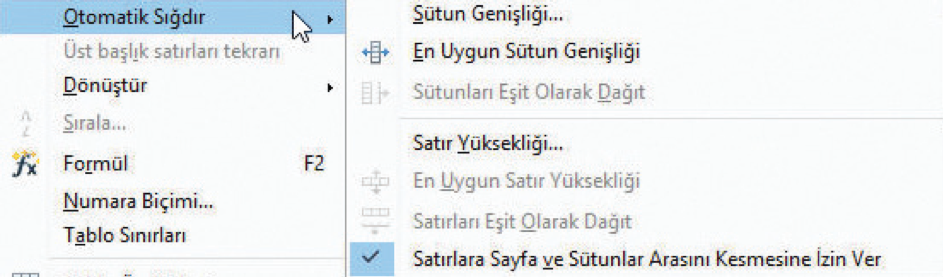 Tablo içerisindeki hücrelere girilen değere göre tablo sütun ve satır boyutlarının otomatik olarak ayarlanmasını sağlayan sekmedir. Otomatik sığdır sekmesi ile açılan yan pencere özellikleri, tablo içerisindeki değere göre aktif veya pasif olabilir. Resimde sekmenin yana açılır penceresini göstermektedir. Ayşegül’ün tüm satır yüksekliklerinin eşitoluşturabilmesi için tablodaki satırların hepsi seçtikten sonra Tablo – Otomatik Sığdır – Satırları Eşit Olarak Dağıt sekmesini seçmesi gerekmektedir.