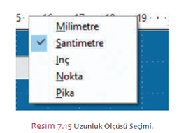 Boyutlandırmada, kullanılmak istenen uzunluk ölçüsüyle uyumlu olacak şekilde cetveller kullanılabilir. Formlarda aşağıdaki seçeneklerde verilen hangi uzunluk ölçüsü bulunmaz?