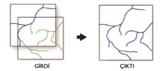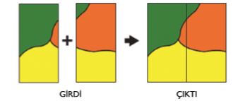 Şekilde görüldüğü gibi konumsal nesne türleri (nokta, çizgi, poligon) ve öznitelik bilgi alanları (tablo kolonları) aynı olan birden çok veri setini tek bir veri seti haline getirme işlemine ne ad verilir?