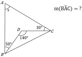 m(DEC)=50+x olur. Diğer taraftan m(DEC)+m(ACD)=m(BDC) => (50+x)+30=140 => m(BAC)=60°'dir.