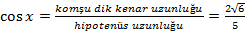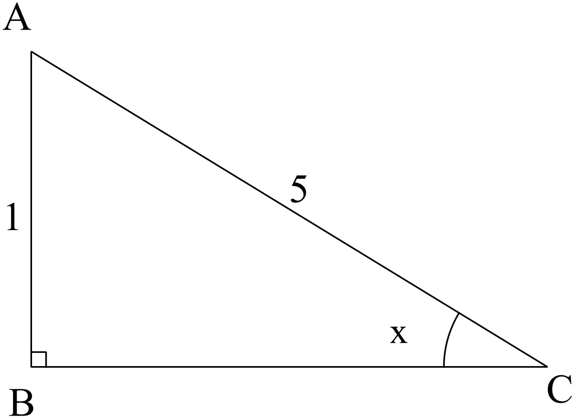 den bir dik üçgende x dar açısının karşısındaki dik kenarı 1 ve hipotenüsü 5 birim alırsak diğer dik kenar uzunluğu Pisagor teoreminden