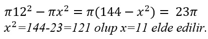 O merkezli ve yarıçapı 12 cm olan bir daireden O merkezli yarıçapı x cm olan bir daire çıkarılıyor. Kalan halkanın alanı ise x kaç santimetredir?