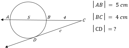 Çemberin teğet kuvvet özelliğinden c2=b.(b+a) => 4.(4+5)=36 => c=6 cm’dir.