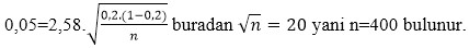 Bir yazar kitabının benzer kitaplar içerisindeki okunma oranının %20 olduğunu kanıtlamak istemektedir. Örnek oranı gerçek ana kütle oranndan ± 0,05 (%5) uzaklıkta olmak üzere %99 güvenirlikle emin olabilmek için ne büyüklükte örnekleme yapmak gerekir?
