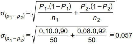 İki ayrı üretim biriminin hatalı üretim yapma oranları karşılaştırılmak isteniyor. Bu amaçla birinci üretim biriminden 50 parça alınıyor ve hatalı ürün oranı 0,10 bulunuyor. İkinci üretim biriminden de 50 parça alınıyor ve hatalı ürün oranı 0,08 olarak bulunuyor. Bu verilere göre iki ana kütle oranları arasındaki farkların standart hata değeri kaçtır?
