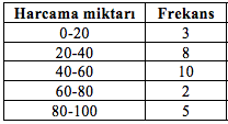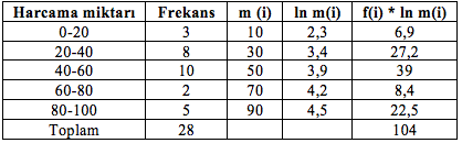 Aşağıda frekanslarla çoğunlukları belirtilmiş insanların belli bir gıda maddesi için aylık yaptıkları harcama miktarları gruplandırılmış seri olarak verilmiştir. İnsanların bu gıda maddesi için yaptıkları harcamanının geometrik ortalaması kaçtır?