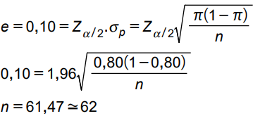 Bir pazarlama şirketi insanların %80'inin giyim ihtiyaçlarını mağazalara gitmeden internet üzerinden aldığını iddia etmektedir. Örnek oranının gerçek ana kütle oranından ±0,10 (%10) uzaklıkta olacağından (ana kütle oranının tahmininde %10 hata yapılacağından) %95 güvenirlikle emin olabilmek için hangi büyüklükte örnekleme yapmak gerekir?