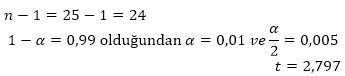 (1 - α) = 0,99, α = 0,01 ve α / 2 = 0,005 ve serbestlik derecesi v=n-1=25-1=24 olduğundan Student t çizelgesinden olduğundan tα/2,v = t 0,005,24 = 2,797’dir.