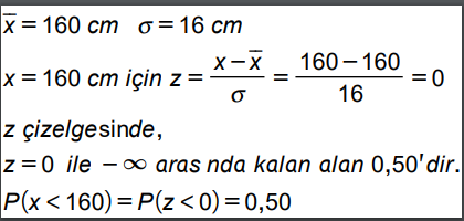 Belli bir yaş grubunda bulunan 10.000 öğrencinin boy uzunlukları ortalaması 160 cm ve standart sapması 16 cm olan normal dağılıma sahiptir. Boy uzunluğu 160 cm'den az olan öğrencilerin oranı kaçtır?