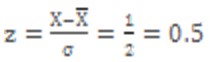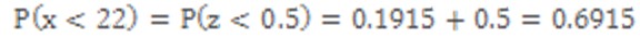 X=22 için olduğundan, z tablosundan 0.5 değerine bakılır ve ilgili değerin 0.1915 olduğu görülür. Bu değer, normal dağılımın ortalaması (21) ile 22 yi olasılık olarak temsil eden 0.5 değer arasındaki bölgeyi temsil etmektedir. 22 den küçük değerler için, normal dağılımın orta noktasının solundaki bütünlük anlamındaki 0.5 değerini de dahil etmek gerekir.