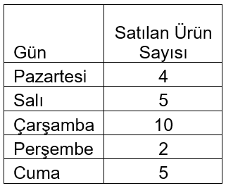 Aşağıda bir işletmenin 5 gün boyunca yaptığı satışlar listelenmiştir. Bir haftalık satış sayısının aritmetik ortalaması nedir?