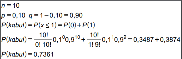Bir fabrikada kalite kontrol birimi üretilen ürünler içinden 10 ürünü tesadüfi olarak seçiyor ve eğer ürünlerden 2 veya daha fazlası bozuk çıkarsa bu grup ürünü reddediyor. Yapılan kontrollerde bir grupta 0,10 bozuk ürün bulunduğu bilindiğine göre grubun kabul edilme olasılığı nedir?