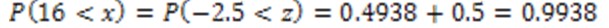 X=16 için olduğundan z tablosundan 2.5 değerine bakılır ve ilgili değerin 0.4938 olduğu görülür. Bu değer normal dağılımın ortalaması (21) ile 16yı olasılk olarak temsil eden -2,5 değer arasındaki bölgeyi temsil etmektedir. 16 dan büyük değerler için, normal dağılımın orta noktasının sağındaki bütünlük anlamındaki 0.5 değerini de dahil etmek gerekir.
