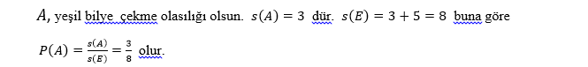 Bir torbada bulunan 3 yeşil, 5 kırmızı bilye içinde rastgele çekilen bir bilyenin yeşil çıkma olasılığı aşağıdakilerden hangisidir?