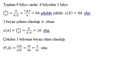 Bir torba içinde bulunan 9 bilyenin 4 tanesi kırmızı, 5 tanesi beyaz bilye dir. Torbadan gelişigüzel 3 bilye çekiliyor. Çekilen 3 bilyenin beyaz olma olasılığı aşağıdakilerden hangisidir?
