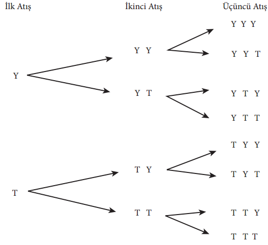 Bir madeni paranın 3 kez atılmasında 8 farklı sonuç vardır. Paranın atılma deneyini ağaç diyagramı ile gösterirsek ilkinde yazı sonrasında 2 kez tura gelme olayının 1 kere gerçekleştiğini görürüz. Toplam olay sayısı 8 olduğundan olasılık: