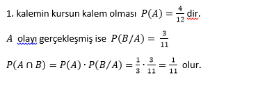Bir kalem kutusunda 4 kurşun kalem, 8 tane tükenmez kalem vardır. Rastgele 2 kalem çekiliyor. İlk çekilen geri konulmuyor. İkisinin de kurşun kalem olması olasılığı nedir?