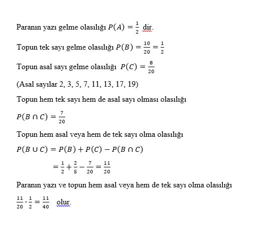 Bir torbada 1 den 20 e kadar sıralanmış 20 top vardır. Madeni bir para havaya atılıp torbadan bir top çekiliyor. Paranın yazı ve çekilen topun asal sayı veya tek sayı olma olasılığı nedir?