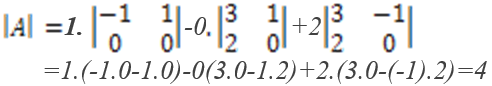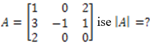 3X3 tipindeki bir matrisin determinant: şeklinde hesaplanmaktadır. Buna göre, A matrisinin determinantı,